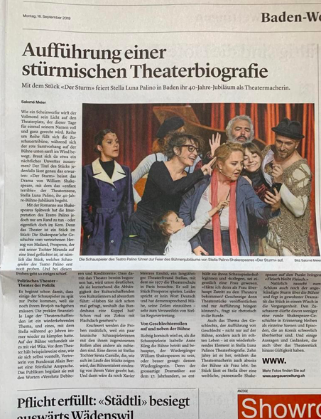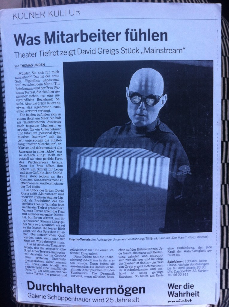 „….Vanessa Torres spielt die Frau mit atemberaubender Intensität. Mit ihrem Akzent, mit ihrer heiseren Stimme klingt jeder Satz so dramatish, als sei es ihr letzter. Ihr leerer Blick zeigt, wie das Sprechen zu einer übermenschlichen. Qual werden kann, wenn man sich Wort um Wort abringen muss.“