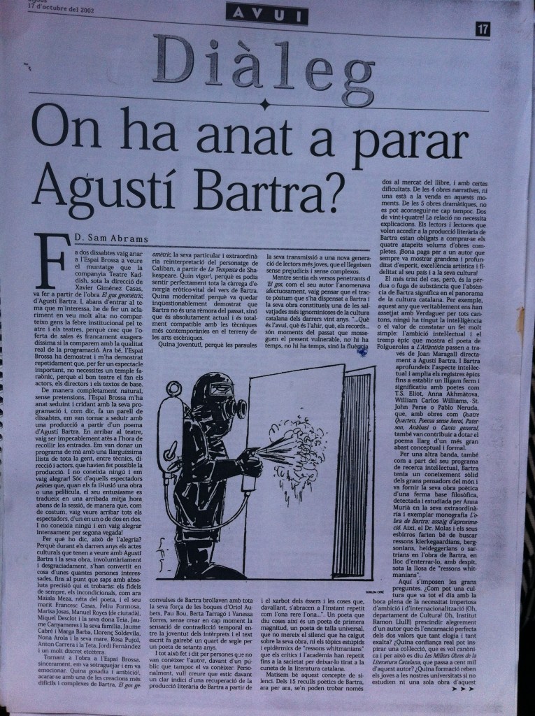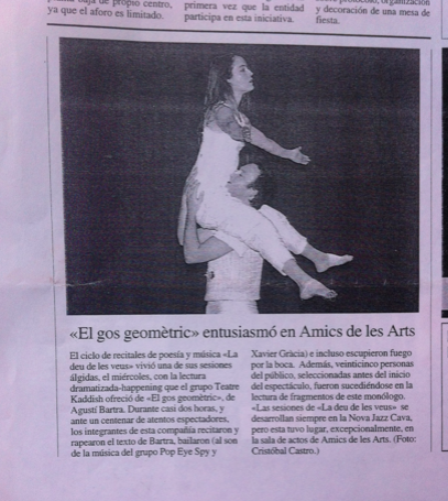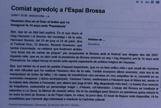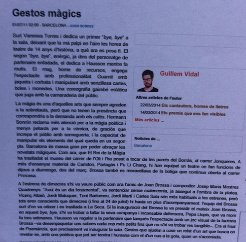 „….Ara, Vanessa Torres, una acompanyant habitual amb Brossa, cobra un pes específic que permet donar un tomb al clàssic espectacle de màgia…….Ja no és allò de a veure quina ens fan ara,sinó que també hi ha un joc (….) que dóna aire i revitalitza………El segon capítol és molt més festiu. El mag s’atreveix a ballar. Vanessa Torres, que llueix una omnipotent perruca rossa, multiplica la seva força al fons de l’escena. Agafa un to de còmica genial……..“